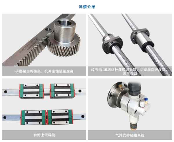 ◆三軸運(yùn)動(dòng)采用進(jìn)口高精度導(dǎo)軌、斜齒齒條,伺服電機(jī)及減速機(jī),使X軸鋁型材自行設(shè)計(jì)開發(fā)模具,保證設(shè)備運(yùn)行過程中的穩(wěn)定性。